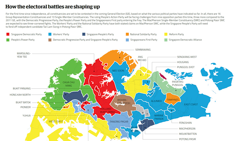 Opposition parties have indicated so far that they will gun for all 16 Group Representation Constituencies (GRCs) and 13 Single-Member Constituencies (SMCs), with three-cornered fights expected in the MacPherson and Potong Pasir SMCs.