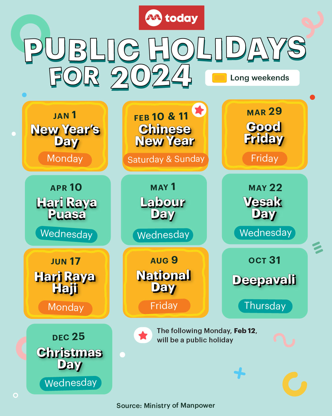 As the second day of Chinese New Year falls on Sunday, Feb 11, the following Monday will be a public holiday.