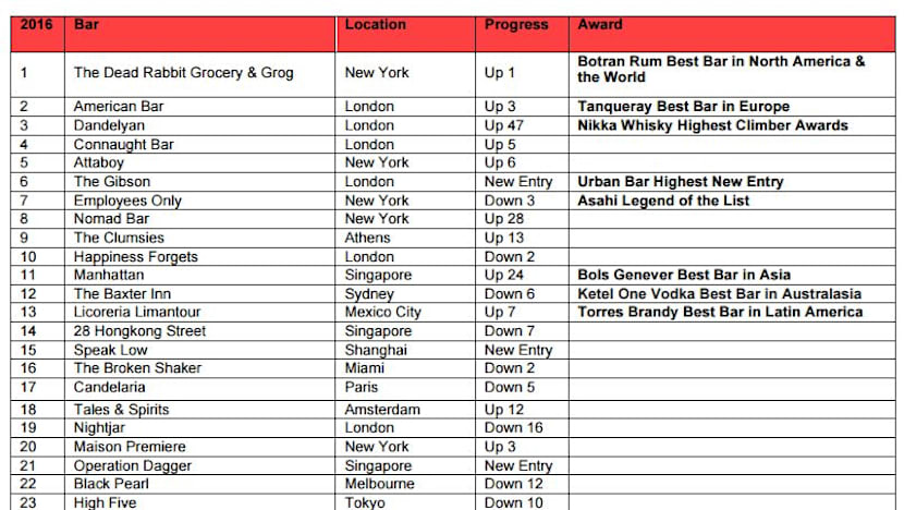 Manhattan Bar, which jumped up 24 places to land at No 11, also leads the Asia ranking. Two other Singapore bars made it to the list: Familiar name 28 Hongkong Street, dropped seven places to land at No 14, and new entry Operation Dagger, debuted at No 21.