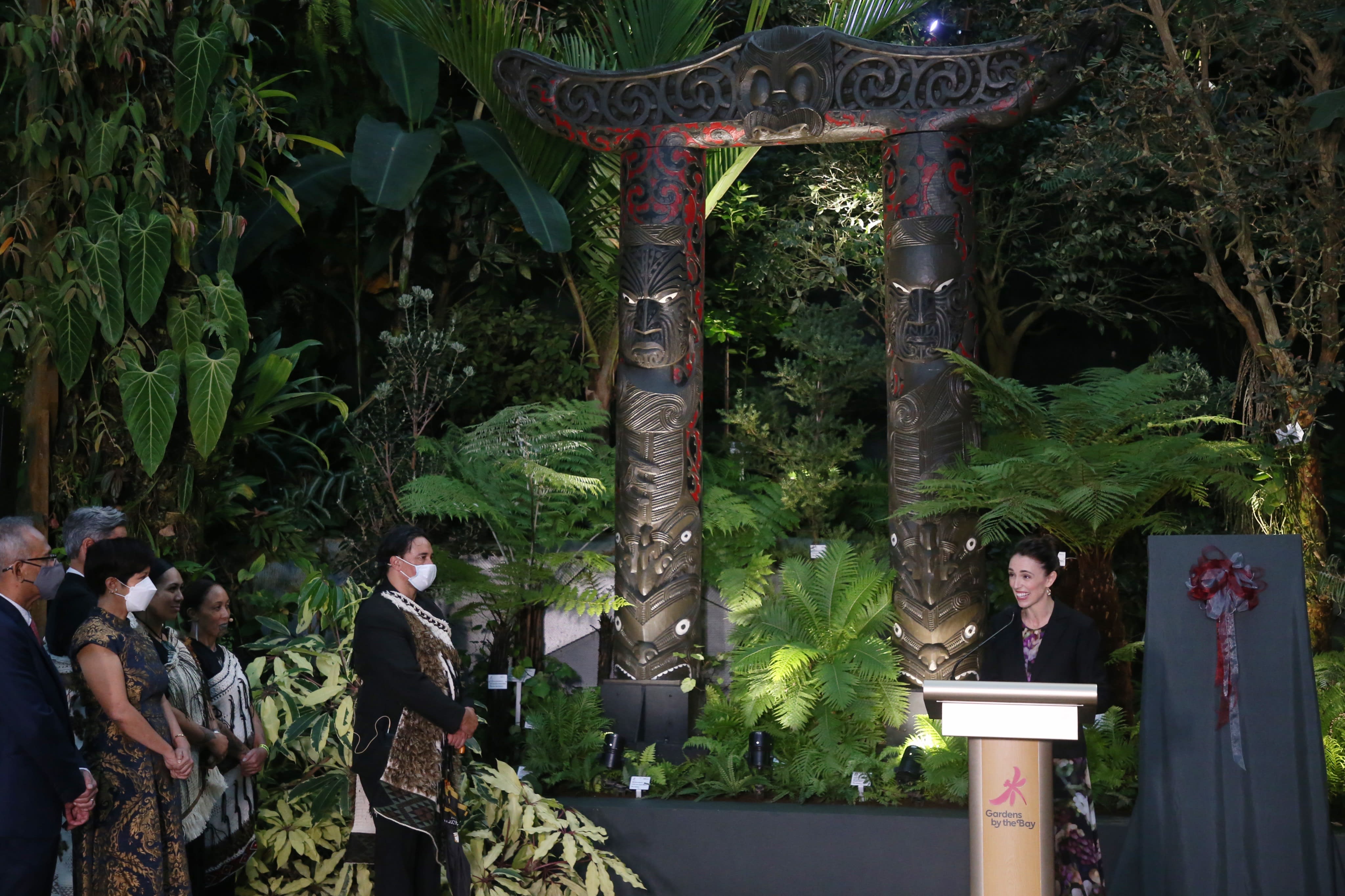 Ms Ardern visited the Gardens by the Bay on Tuesday evening, where she unveiled a Māori Kūwaha carving. The Kūwaha represents a symbolic doorway celebrating cultures, beliefs and identities.