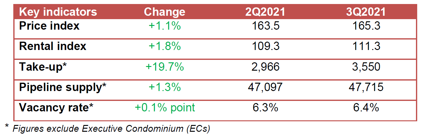 The private residential property price index increased to 165.3 points in the third quarter, up from 163.5 points in the second quarter, according to real estate statistics released by the Urban Redevelopment Authority (URA) on Friday (Oct 22).
