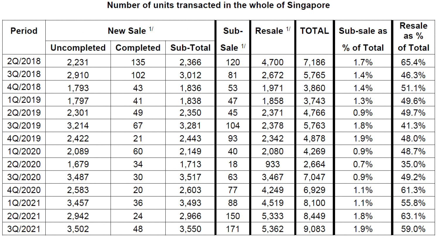 In all, 9,083 private residential properties were transacted across Singapore in the third quarter, with resale homes making up the bulk at 5,362 units.