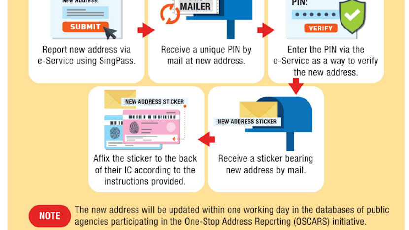 Applicants will then need to enter the PIN via the e-service for verification. After that, they will receive an instant acknowledgement of successful change. A second mail will be sent containing a sticker of their new address, which must be affixed to the back of their ICs.