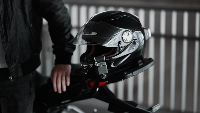 A five-megapixel wide-angle camera attached to the rear projects a live 170-degree rear-view vision of the road onto a thumb-sized eyepiece, to help the rider to keep track of his blind spots.