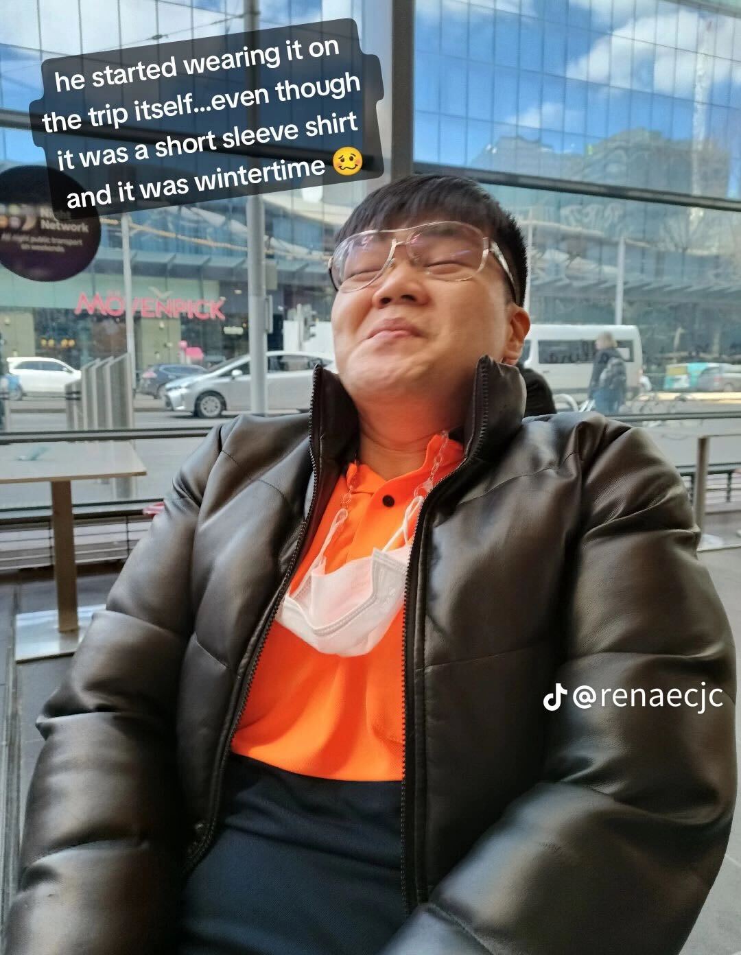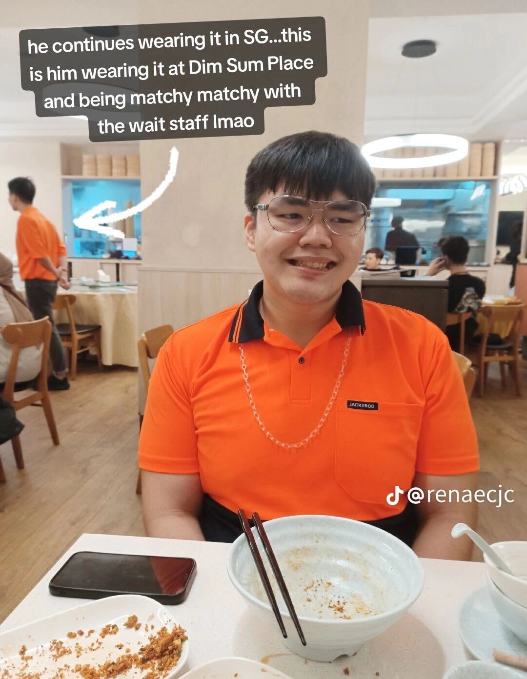 The slideshow, posted by Ms Renae Cheng, shows her fiance Yap Heng Soon sporting a neon orange and black top everywhere he goes.