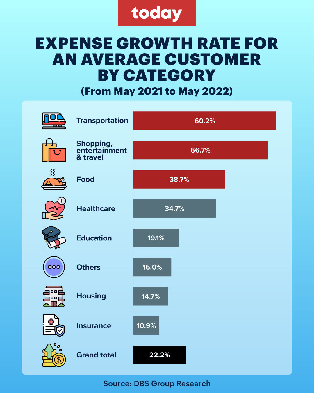 SINGAPORE — A study by DBS bank has found that the monthly expenses of its customers grew 22.2 per cent this May compared to May last year, which is twice that of their income growth of 11.1 per cent in the same period.