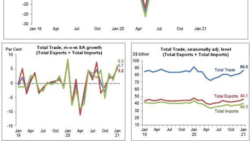 The level of total trade, on a seasonally-adjusted basis, reached S$86.6 billion in January, higher than the previous month’s S$81.9 billion.