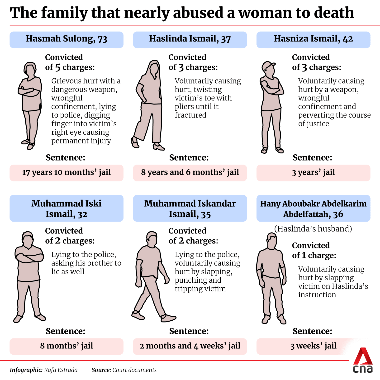 Over about one-and-a-half years from mid-2016, the Ismail family tortured and enslaved the victim. They knocked out her teeth, fractured her toes and poured hot oil and scalding hot water on her.
