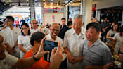 Senior Minister Lee Hsien loong with the PAP candidates for Aljunied GRC at Pasar Makan Hawker Centre at Bedok Reservoir on Apr 29, 2025. (Photo: CNA/Lauren Chian)