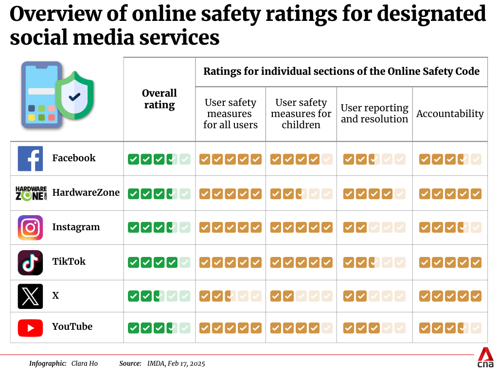 Six social media services - Facebook, HardwareZone, Instagram, TikTok, YouTube and X (formerly Twitter) - were evaluated on how thorough and effective their measures met the Code of Practice for Online Safety.