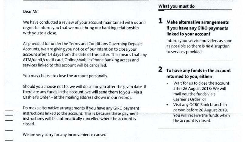 In the letter of notification, copies of which were seen by TODAY, no reason was given. OCBC merely said it had conducted a review of accounts maintained with the bank.