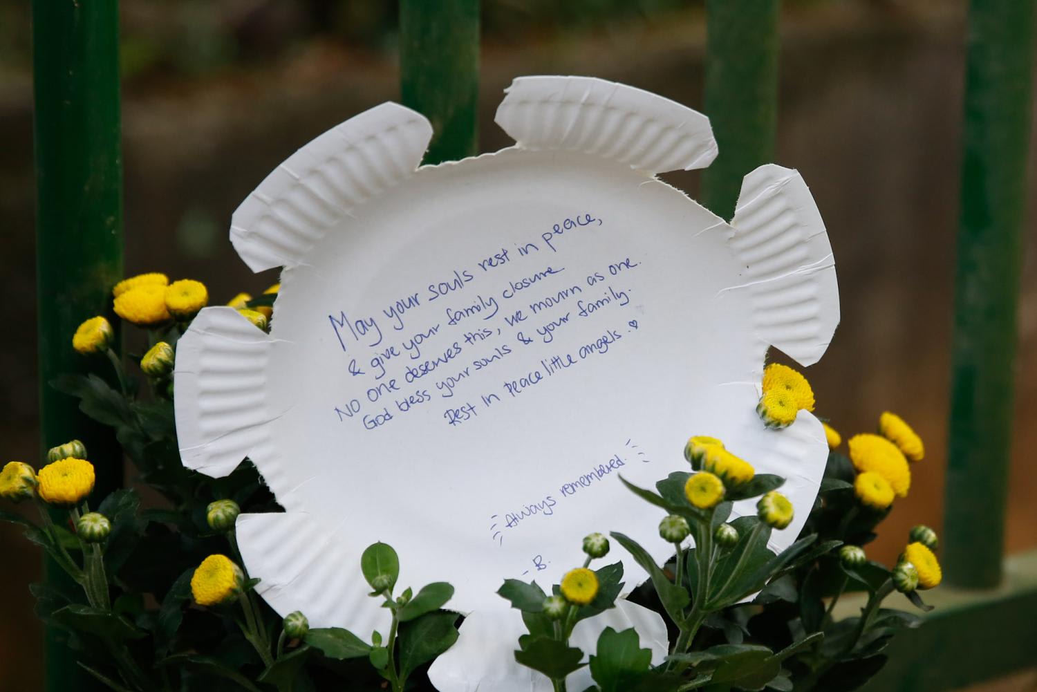 One sign, handwritten on a paper plate that was cut in the shape of a flower, read: “May your souls rest in peace and give your family closure. No one deserves this, we mourn as one.