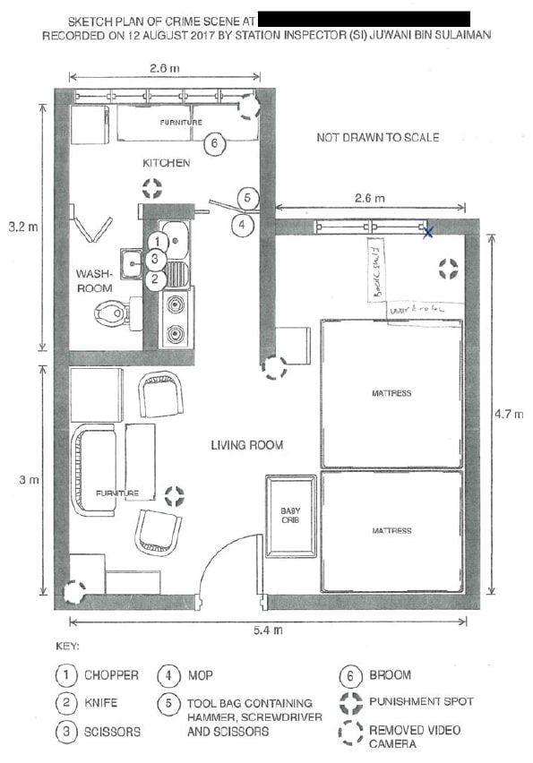 Ayeesha and her brother were confined in two naughty corners, the first barricaded off by a bookshelf and the second in a toilet. (Photos: Court documents)