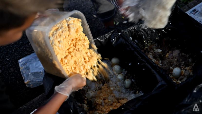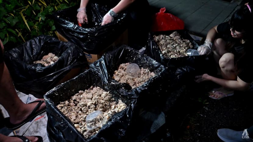 On the day CNA visits, The Stray Affairs food coordinator Ng Weiling has cooked 30kg of donated beef and chicken that was nearing expiry. Volunteers shred the boiled meat by hand and mix it with other foods like hard-boiled eggs.