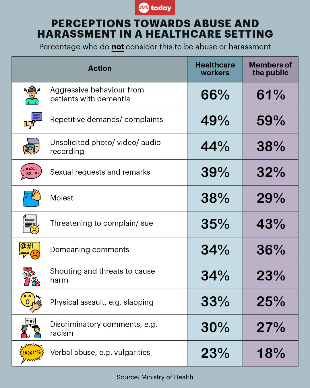- Close to 40 per cent of healthcare workers and about 30 per cent of the public did not consider molest, sexual requests and remarks to be abuse or harassment. The survey did not provide examples of such requests and remarks