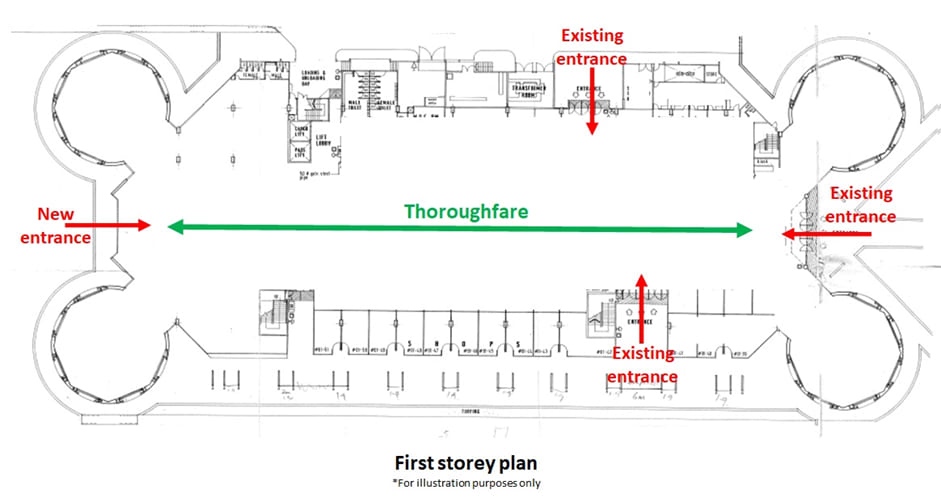 A new entrance will be created on the north side of the building, allowing shoppers to enter from Sims Avenue and Paya Lebar MRT station. This will be linked to an existing entrance on the south side by a thoroughfare.