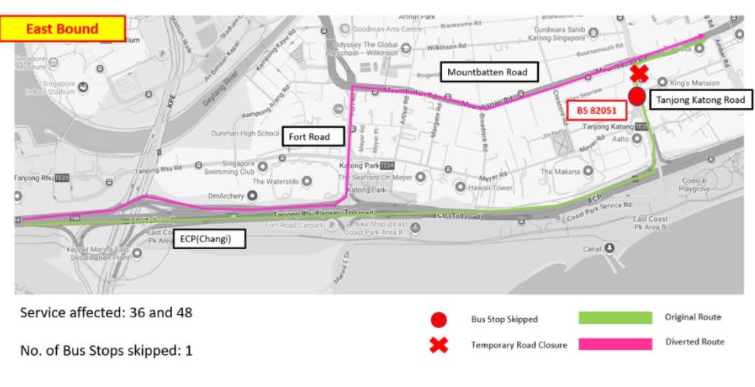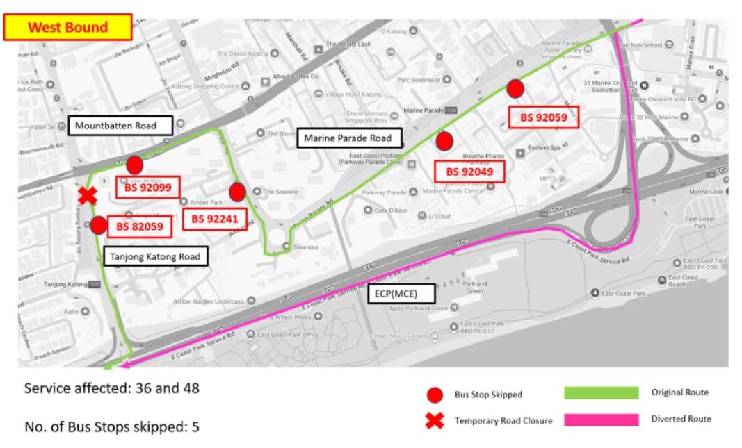 Westbound services will also skip the following bus stops: outside One Amber condominium, Amber Garden, Parkway Parade and Blocks 72 and 74 Marine Parade Road.