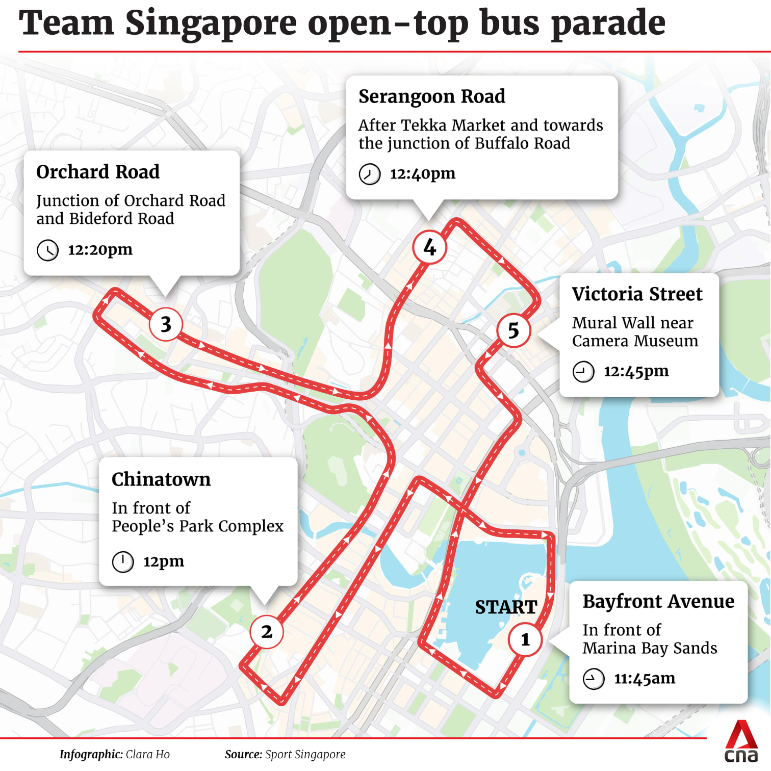 The parade - which will have five "cheer points" - will begin on Bayfront Avenue in front of Marina Bay Sands at 11.45am and take the athletes through Chinatown, Orchard Road, Serangoon Road and Victoria Street. It will pass by the cheer points at these locations at noon, 12.20pm, 12.40pm and 12.45pm respectively.
