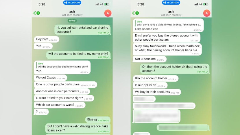 Sellers on Telegram employ two methods: They would either provide someone's personal information, such as a name and National Registration Identity Card (NRIC) number, for customers to use to create a new car sharing account, or they would provide login details of an existing account that belongs to someone else.