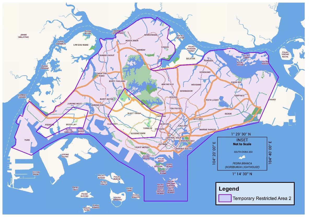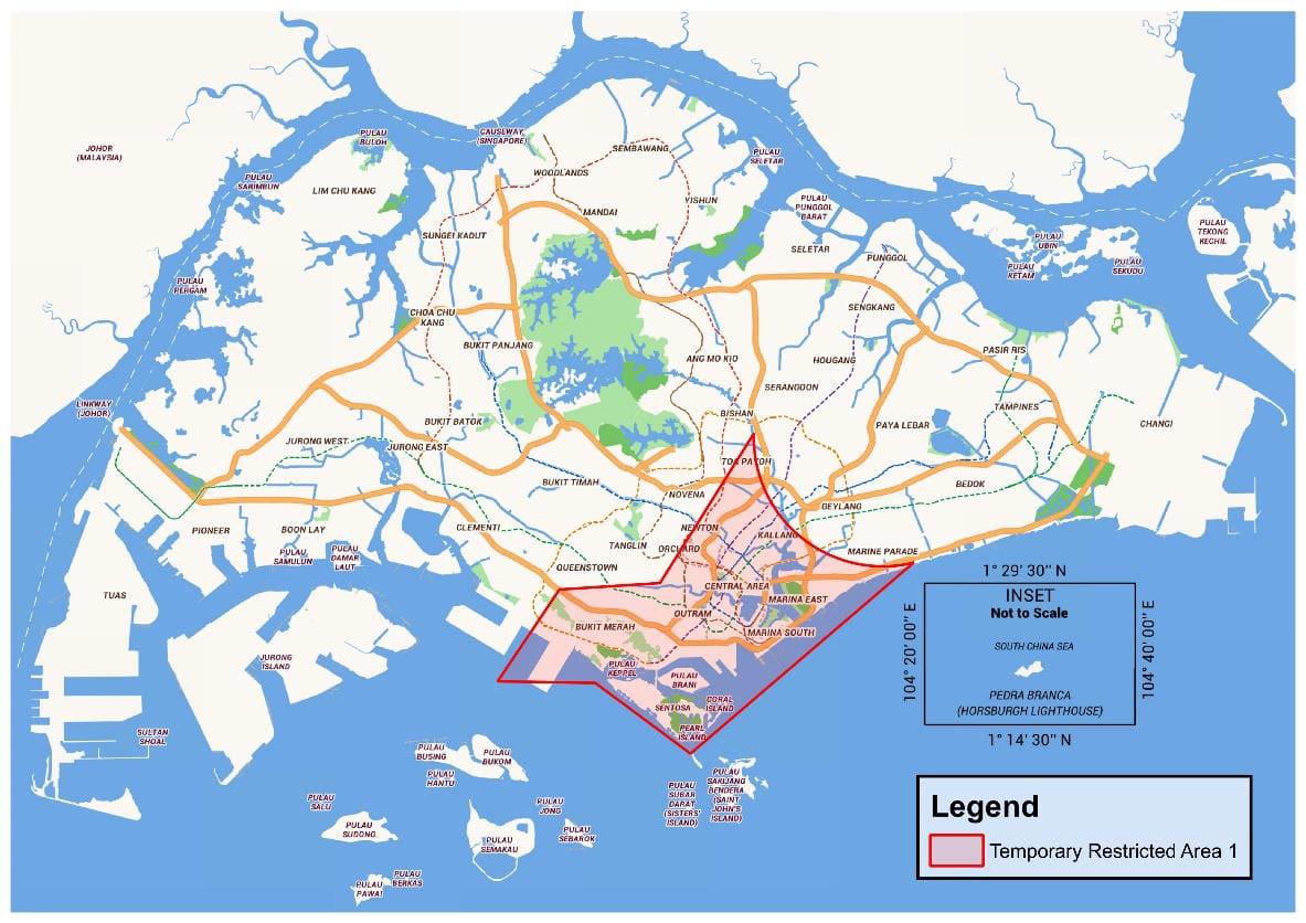 Carrying out aerial and unmanned aircraft activities in the temporary restricted areas without the required permits from CAAS is an offence under the Air Navigation Order (ANO) and the Air Navigation (101 – Unmanned Aircraft Operations) Regulations 2019 (ANR-101) respectively.