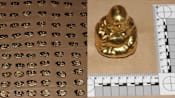 Mini gold-coloured ingots and a gold-coloured mini Buddha statue were seized by police. (Photos: Singapore Police Force)