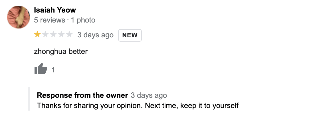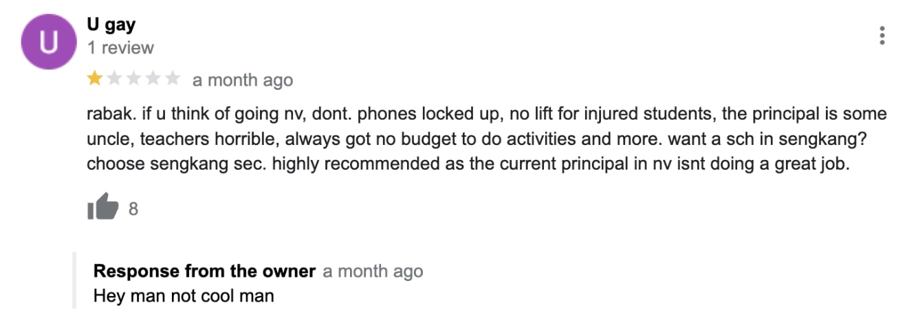 On the reviews for Serangoon Secondary School, one user left a one-star review and claimed that Zhonghua Secondary School was better, to which the admin shot back with this: “Thanks for sharing your opinion. Next time, keep it to yourself.”