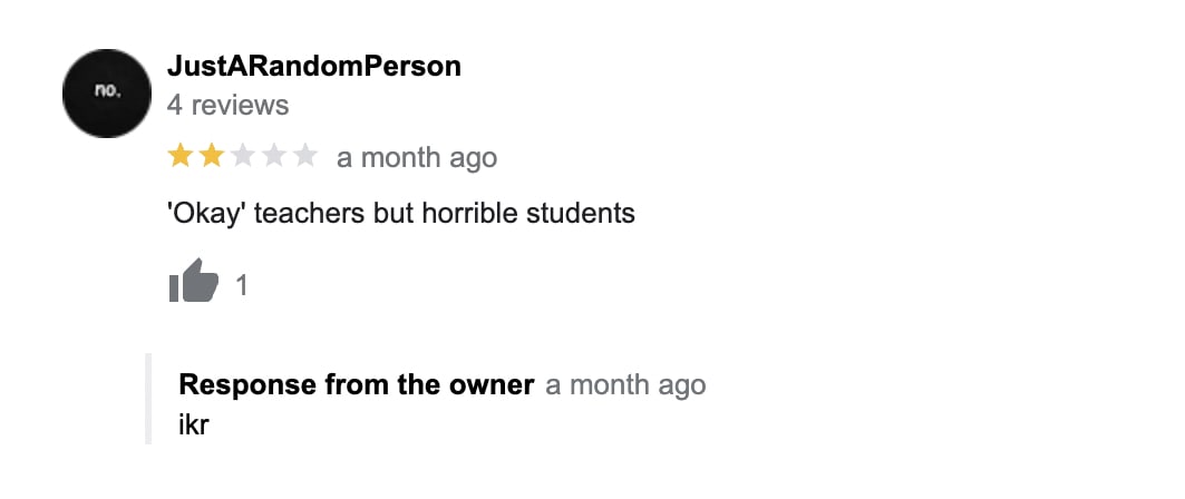 Another reviewer called the school "lousy" and the admin retorted by saying "lousy opinion".