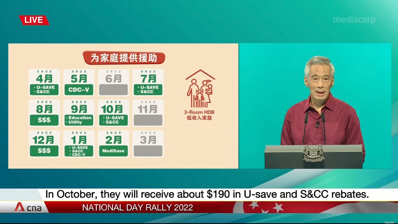 To explain the financial support given to middle- and lower-income Singaporean households, Mr Lee showed a calendar on screen and cited an example of a low-income family living in a three-room Housing and Development Board flat.