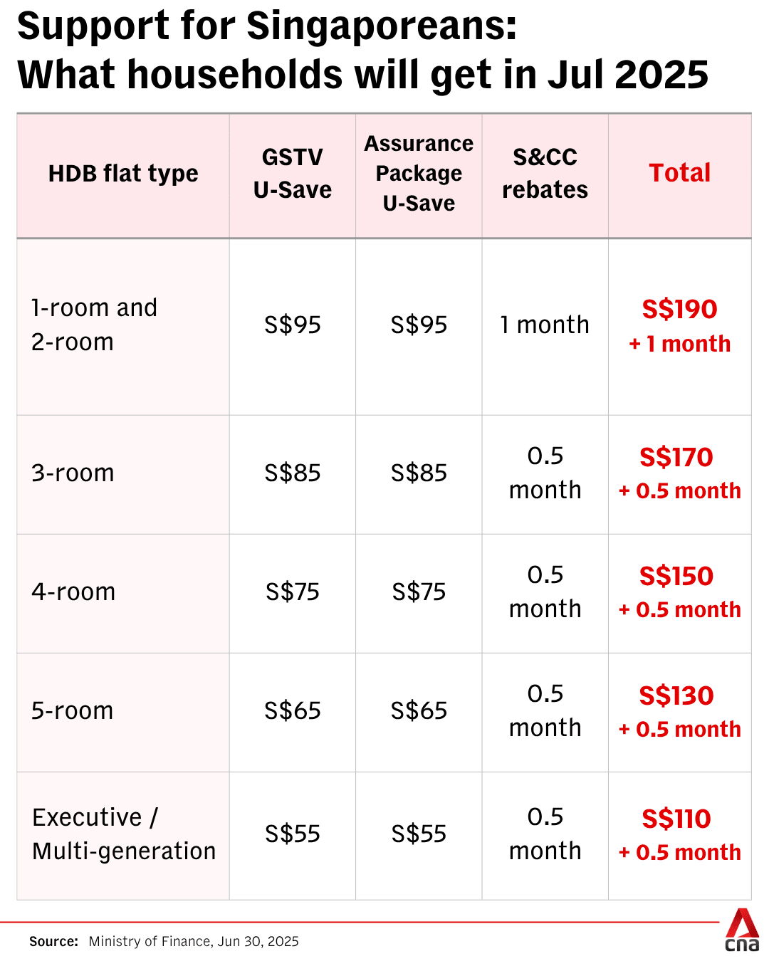 Next month, eligible households will receive up to S$190 (US$149) worth of U-Save rebates, depending on their HDB flat type, the Ministry of Finance said in a news release on Monday (Jun 30).