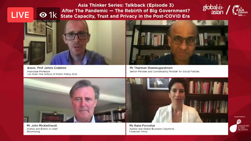 The dialogue was on the topic of whether the Covid-19 pandemic has led to a push for big governments in the future. Apart from Mr Tharman, the other panellists were Mr John Micklethwait, who is news agency Bloomberg’s editor-in-chief, and Ms Rana Foroohar, a global business columnist at the Financial Times.