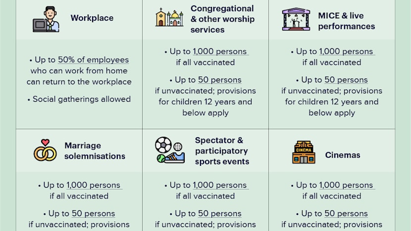Up to 1,000 fully vaccinated attendees — instead of 500 — for marriage solemnisations held at an external venue that is not in a place of residence or in the Registry of Marriages and Registry of Muslim Marriages building will be allowed.