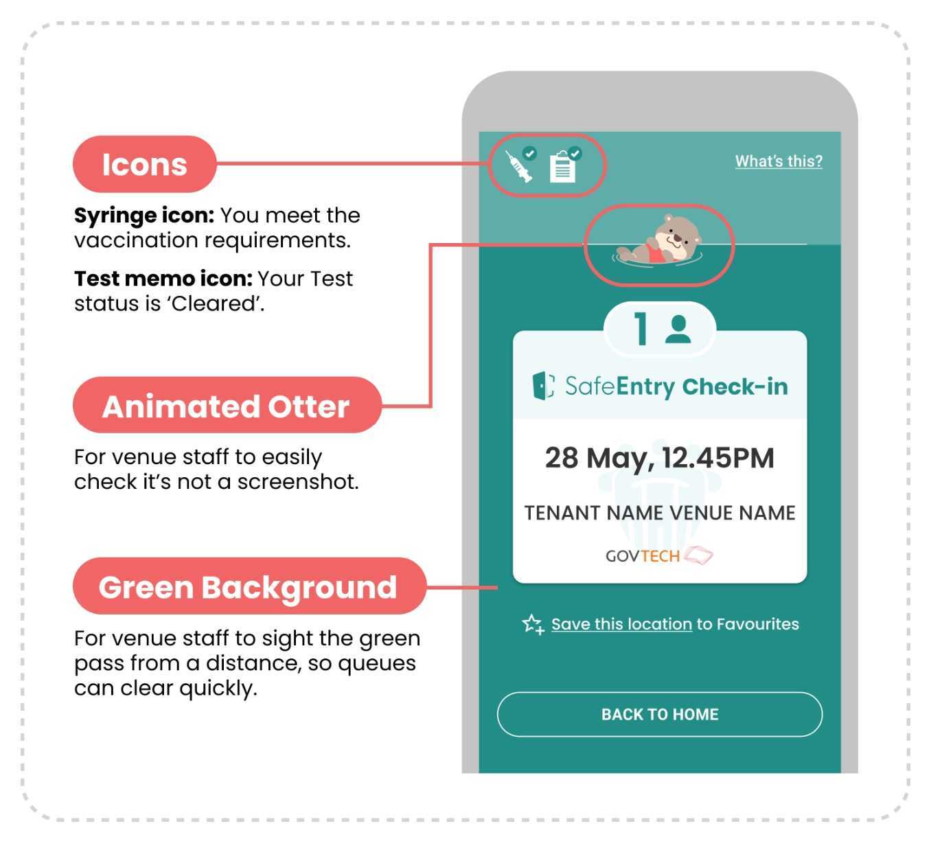 When app users show that they have cleared vaccination and test status checks, an otter against a green background will show up on a green SafeEntry check-in screen.