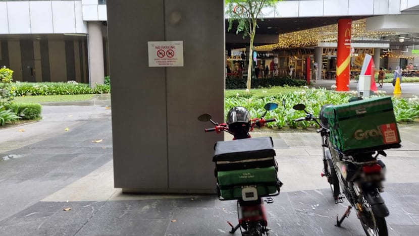 Over two days this week, TODAY visited 10 malls across the island and spoke with nine delivery riders who parked at areas such as pedestrian walkways and near entrances that had no-parking signs.