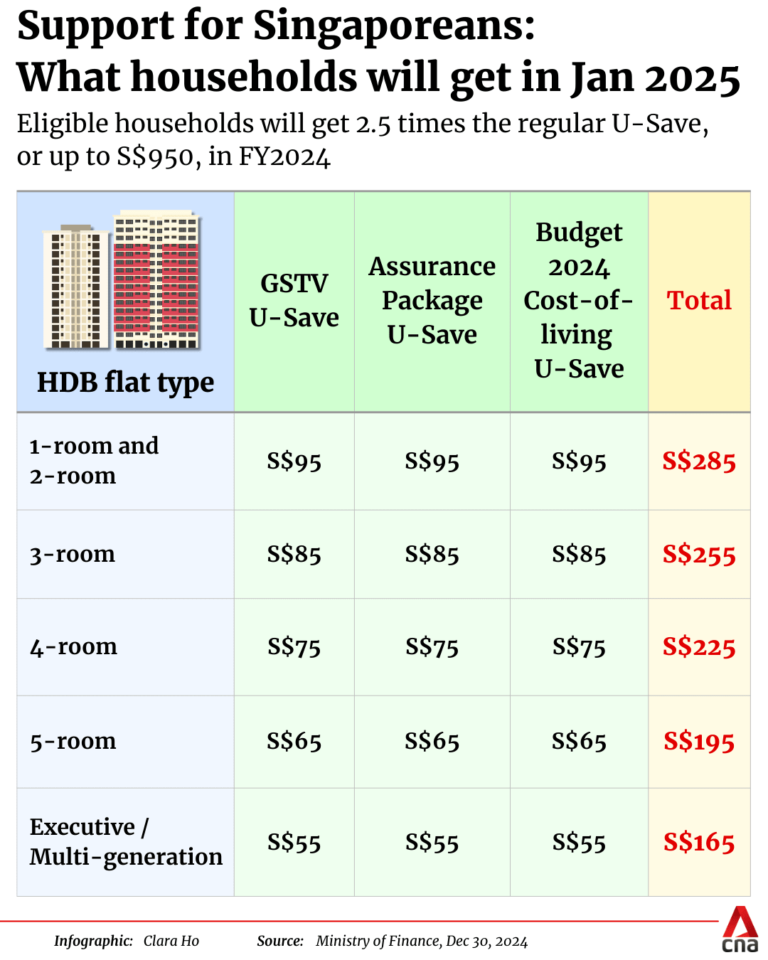 In January, eligible households will receive up to S$285 (US$210) worth of U-Save, depending on their HDB flat type.