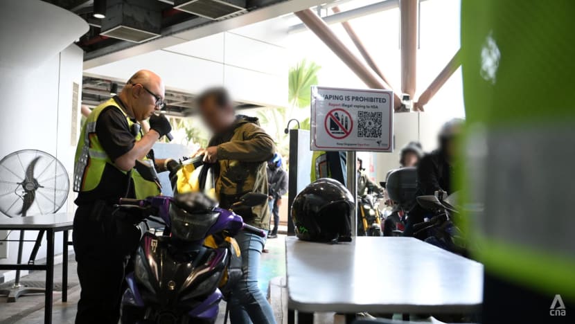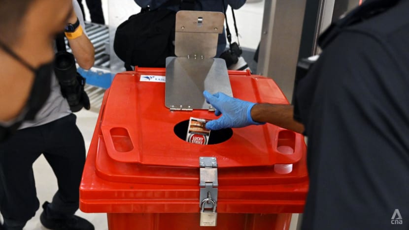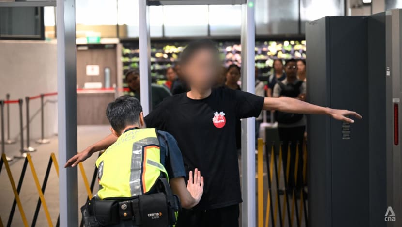 Several people were pulled aside and asked if they had contraband items in their possession. CNA saw some declare their vapes, while a handful handed over cigarette packs.