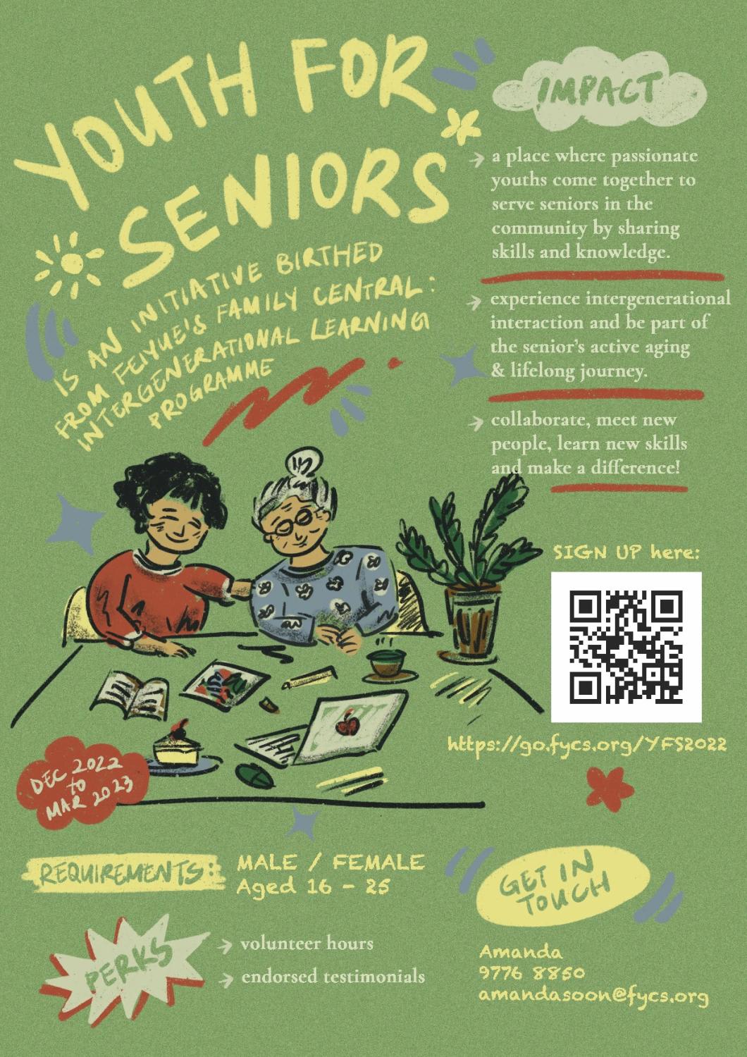 "Volunteers will get to actively participate and contribute ideas for workshops, facilitate sessions, as well as teach, share and interact with seniors," said Fei Yue on its website, adding that these youth volunteers will also experience "intergenerational interaction" and be part of the senior's active ageing journey.