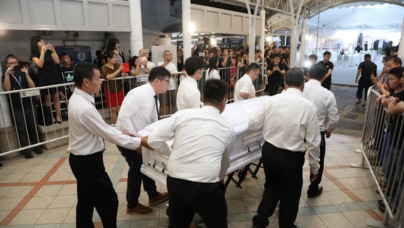 SINGAPORE — The murmuring crowd of about 100 or so people who had gathered at Block 82A, MacPherson Lane, fell into a hush when a white hearse carrying the body of the late actor Aloysius Pang came into sight.