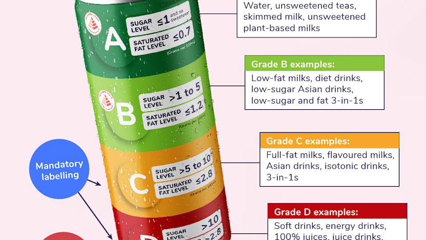 The labels will be mandatory for beverages with grades C and D and optional for drinks within grades A and B. The rollout by the end of next year would give the industry time to adjust to the changes, Mr Tong said.