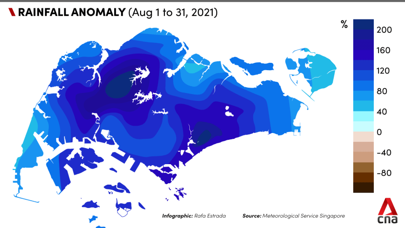At the Changi climate station, a total of 24 rain days was recorded last month, which is well above the long-term average of 14 days for August, said the Met Service.