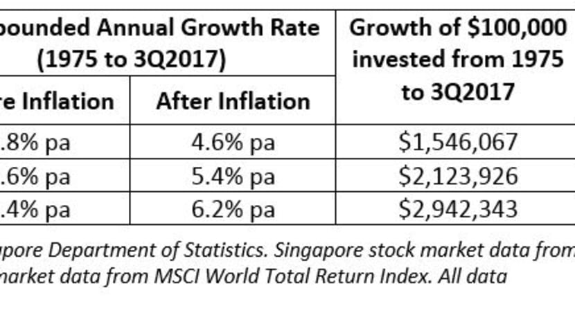Using Singapore inflation and residential property data from the Department of Statistics stretching back to 1975, we found that S$1 invested in residential property for nearly 42 years would have yielded a return of 6.58 times (S$6.58) after inflation. That does not seem too bad, but how does this compare with investing in stocks? We replicated the same time period analysis on the stock markets and found that investing in the local stock market would have yielded a return of 9.04 times (S$9.04), and 12.53 times (S$12.53) if invested in the global stock market over the same period, and after adjusting for inflation. The equivalent annualised returns are shown in the table below.