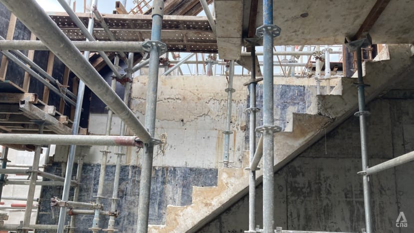 A worksite at 35 Gilstead Road was found to have several workplace safety breaches such as a lack of barricades around a hole in the floor that workers can fall into and protruding starter bars that can cause injury. (Photo: CNA/Abigail Ng)