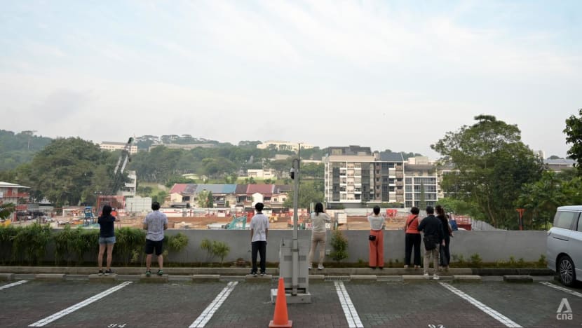 A family in awe while they watch the detonation of a World War II bomb relic from Block 153 Gangsa Road on Sep 26, 2023. (Photo: CNA/Raydza Rahman)