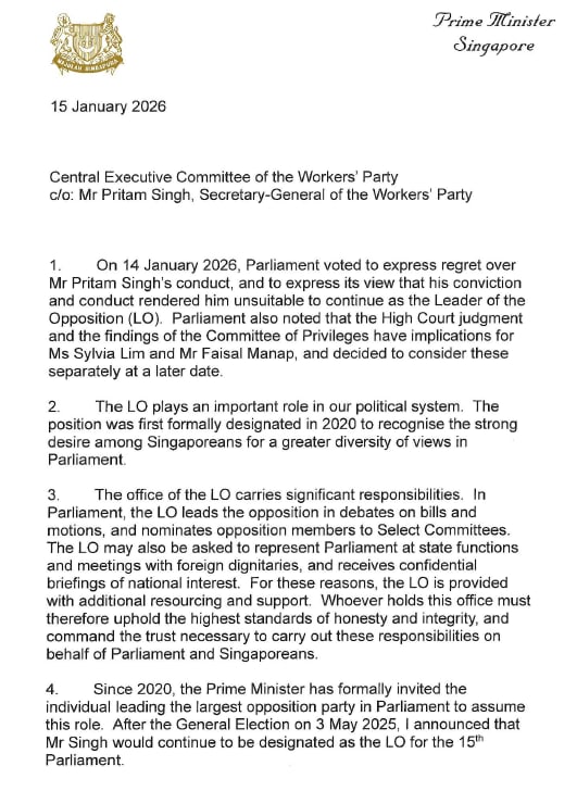 "For these reasons, the Leader of the Opposition is provided with additional resourcing and support. Whoever holds this office must therefore uphold the highest standards of honesty and integrity, and command the trust necessary to carry out these responsibilities on behalf of parliament and Singaporeans," he wrote.