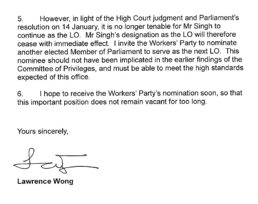 Mr Wong added that he has invited the WP to nominate another elected Member of Parliament to serve as the next Leader of the Opposition.