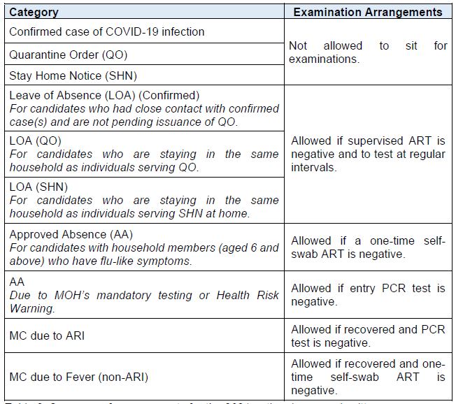 Those on approved absence due to being placed on the Ministry of Health’s (MOH) mandatory testing regime or Health Risk Warning alert must complete their MOH-mandated entry polymerase chain reaction test and test negative before they can sit for their examinations.