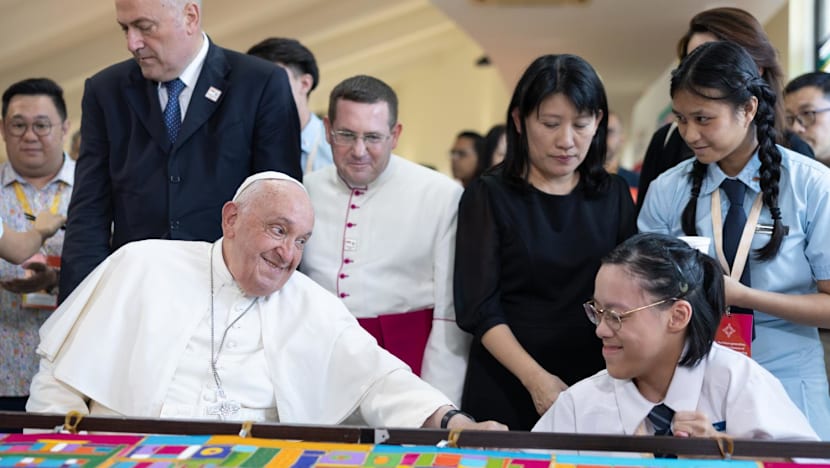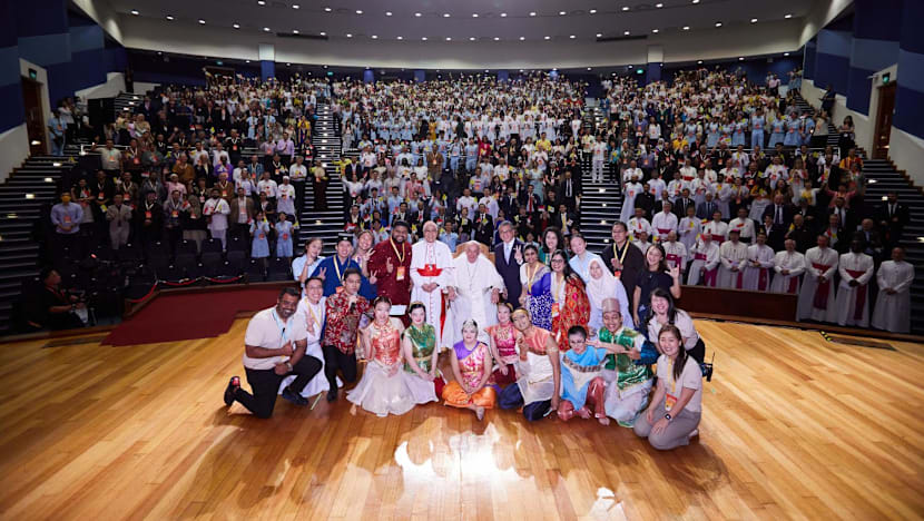 Pope Francis takes part in an interreligious meeting with youth at Catholic Junior College on Sept 13, 2024.