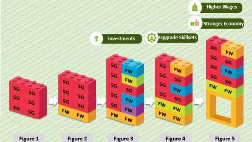 The ideal scenario, if Singapore were to maintain zero foreign workforce growth, would be to improve productivity in the S$5,000 jobs as much as possible so that the two workers could be released to work in the higher-paying jobs, Mr Chan said.