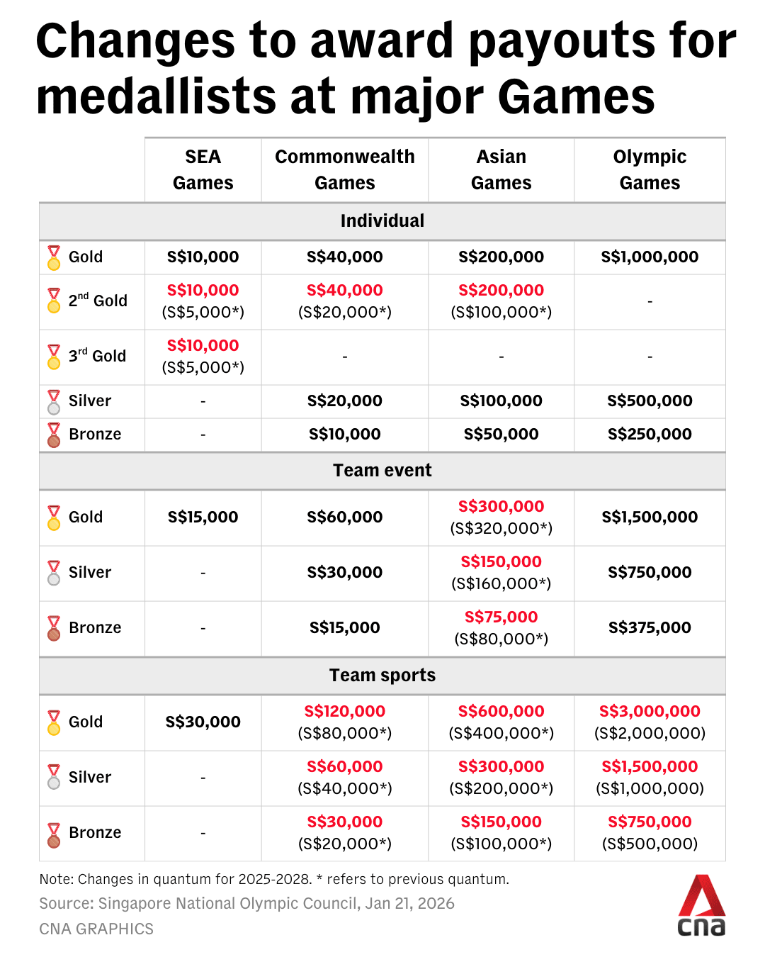 The changes will see the award payout for the second and third gold medals at the SEA Games being doubled from S$5,000 to S$10,000.