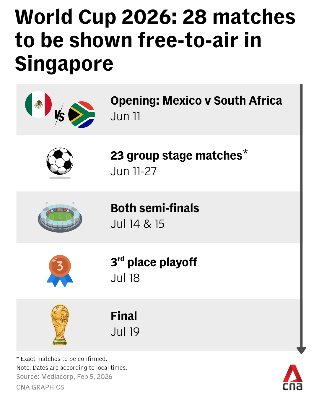 All 104 matches and official ceremonies of the 2026 World Cup will be available to subscribers on Mediacorp's digital platform mewatch and carriage partner platforms, CNA's parent company said in a news release.
