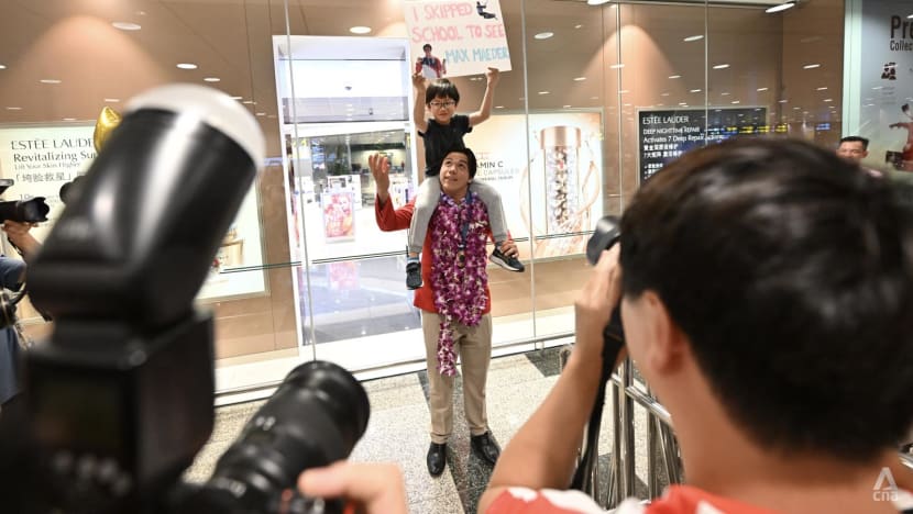Kitefoiler Maximilian Maeder, Singapore’s youngest Olympic medallist at just 17, landed in Singapore at about 6am, and emerged in the arrival area at about 6.25am to jubilant applause and cheers from a crowd of about 50 people.